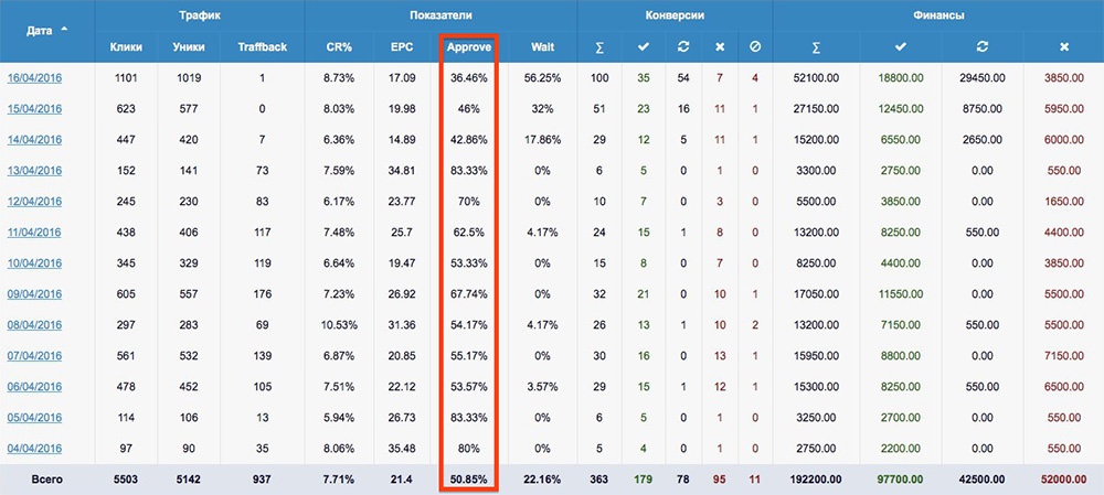 Approve – это арбитражный параметр подтвержденных заявок. Это не целевые действия, а конкретные подтвержденные заявки. Допустим, вы налили траф на ресурс рекла, и 300 пользователей оставили на нем контакты для обратной связи, чтобы с ними связались из колл-центра и они оплатили товар. У вас уже поднимается настроение и вы ждете своих денег, но все еще впереди.