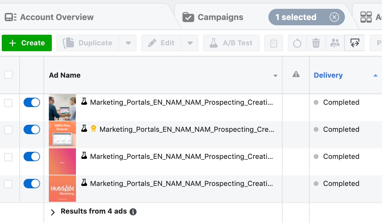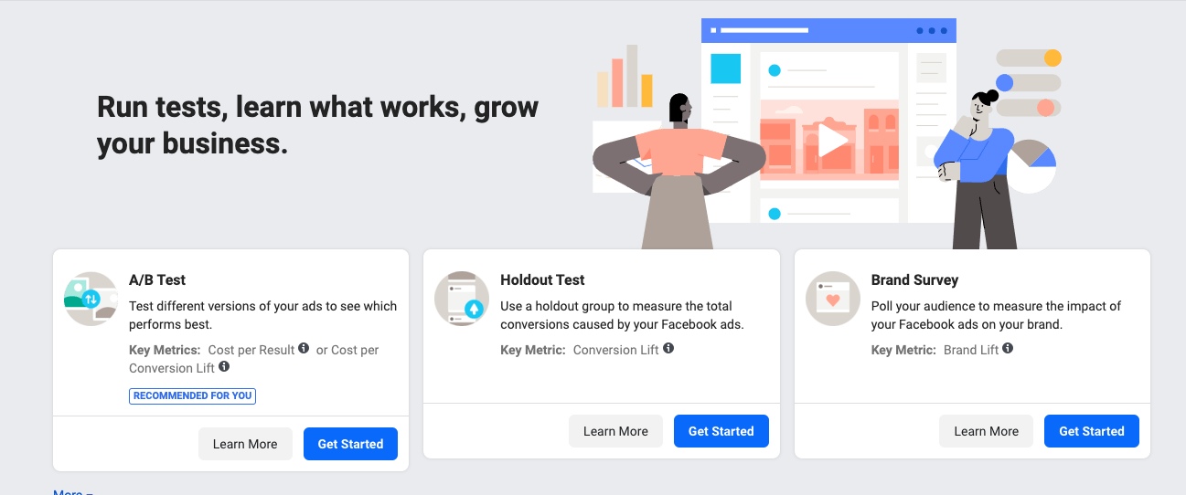 К счастью, вы можете создать A/B-тест на панели инструментов Ads Manager. Данная панель позволит вам использовать рекламную кампанию, которую вы уже создали, в качестве отправной точки для вашего нового теста.