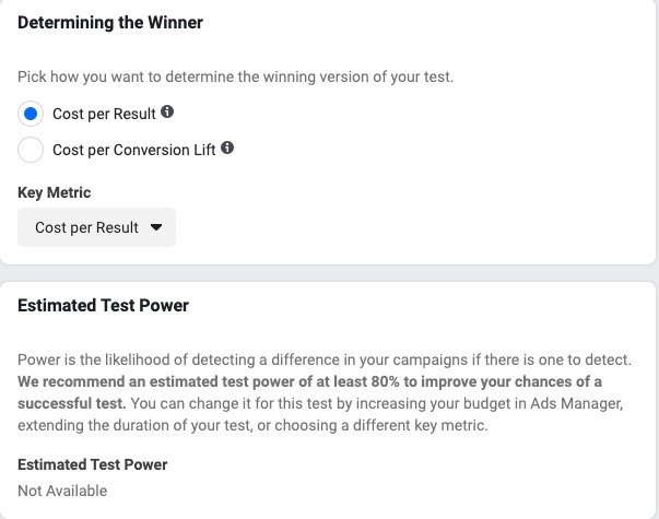 Когда вы закончите заполнять детали, Facebook покажет вам, насколько эффективен ваш тест. По сути, это необходимо для того, чтобы убедиться, что ваш черновик соответствует критериям A/ B-теста, перед публикацией. Заполнив это меню, вы будете готовы провести эксперимент.