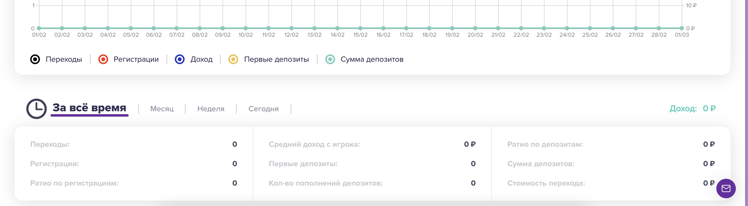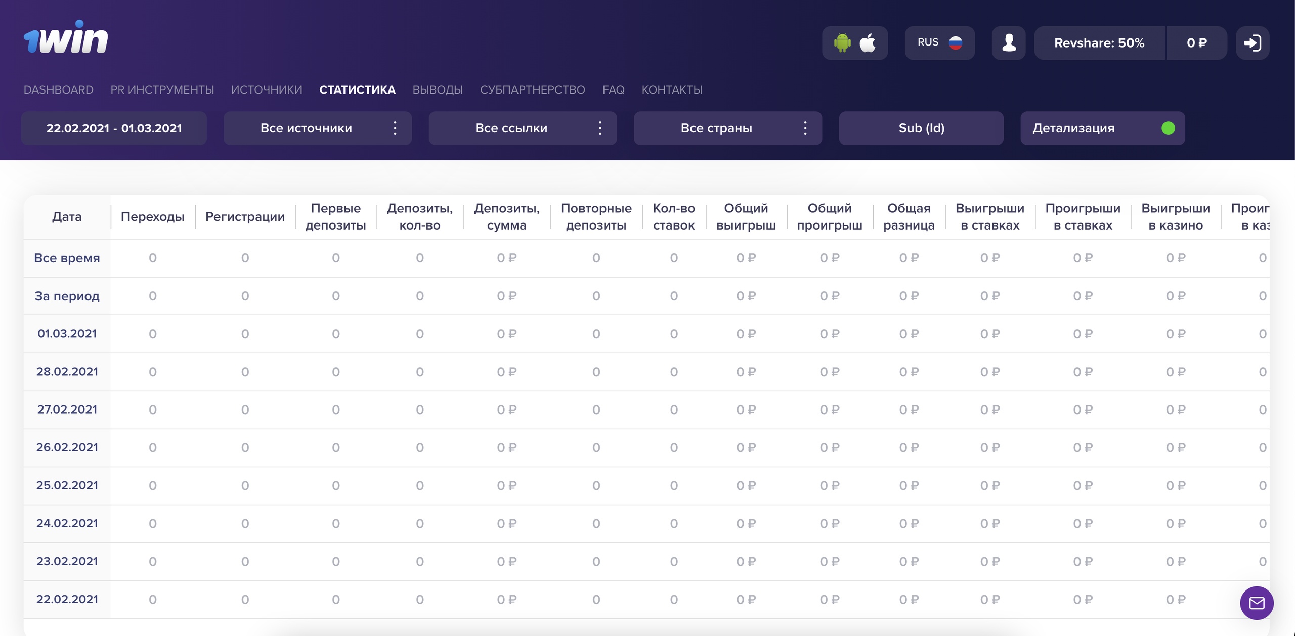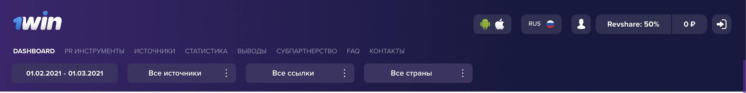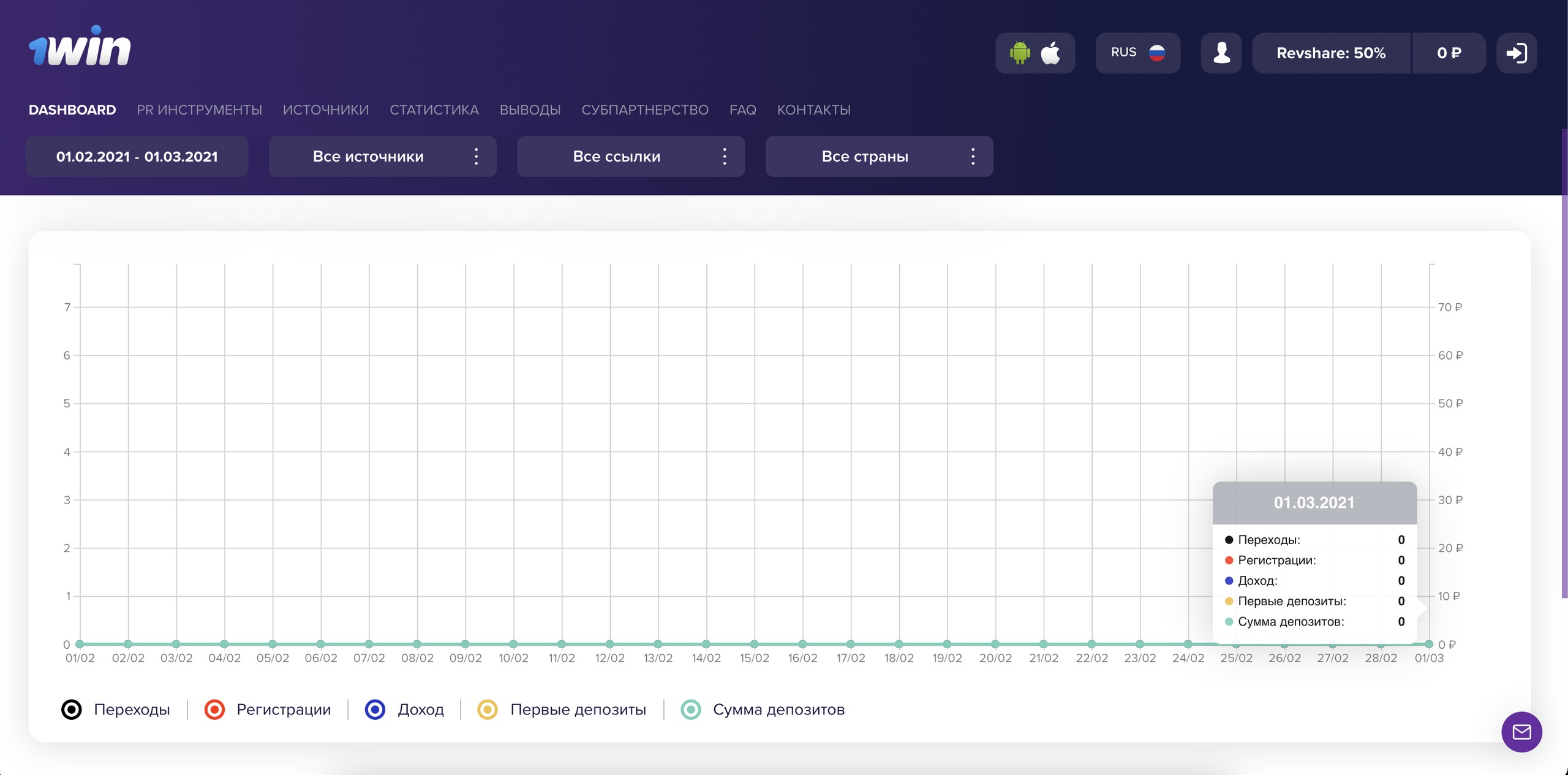 Дашборд — самая первая вкладка, которая служит для отслеживания общих данных внутри партнерки: переходы, регистрации, доход, первые депозиты и сумма депозитов. Здесь вы можете выполнить сортировку по дате, источникам, ссылкам и странам.