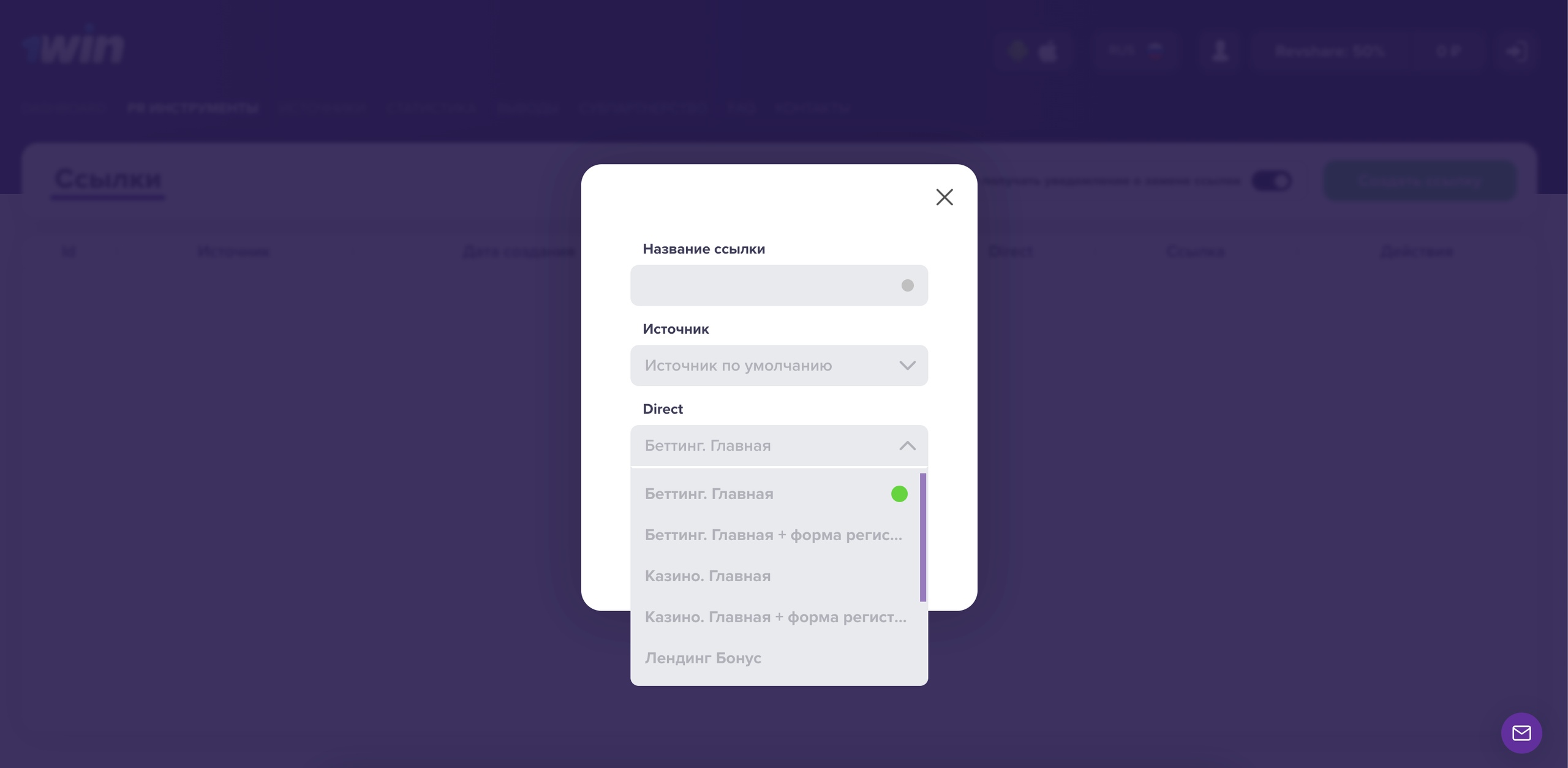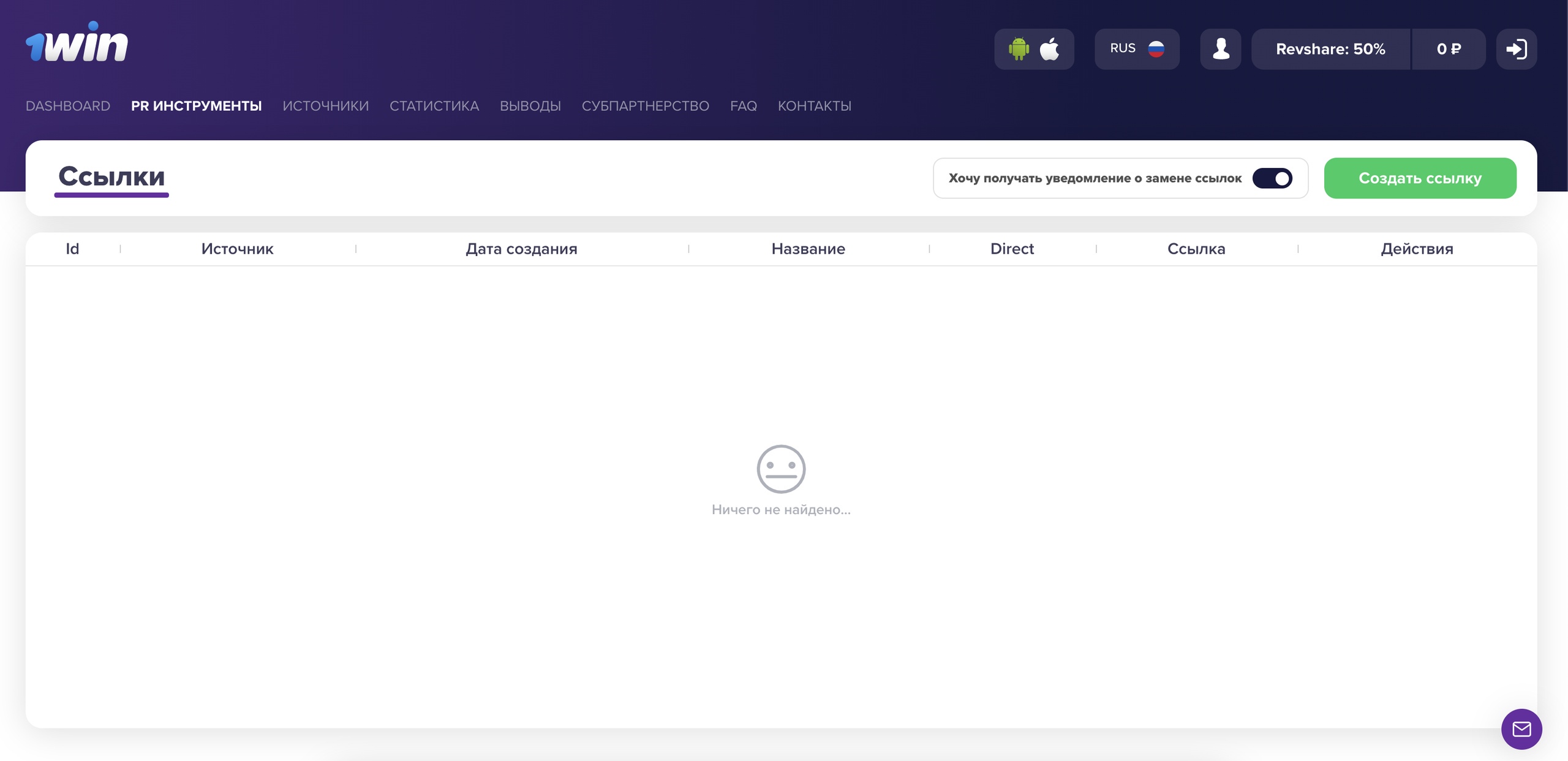 Чтобы создать ссылку, идем сюда: «PR инструменты» -> «Ссылки». Появится следующая страница: