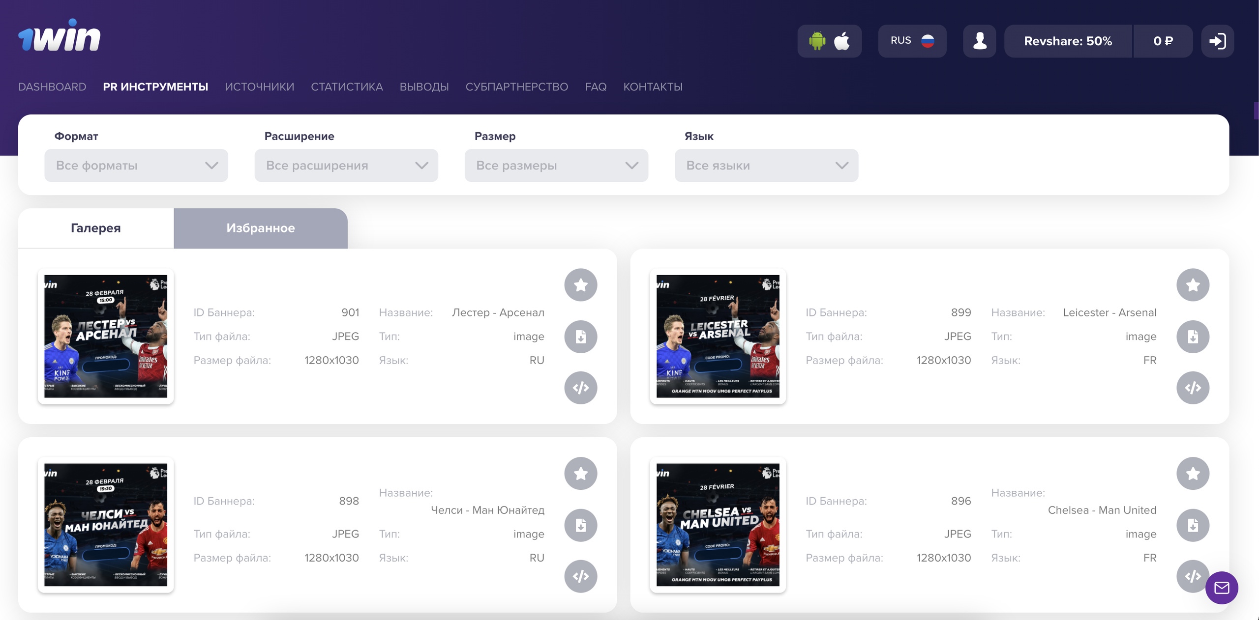 Можно выполнить сортировку по формату, расширению, размеру и языку. Любой креатив свободно выгружается, есть возможность добавить в «Избранное», а также просмотреть код баннера.
