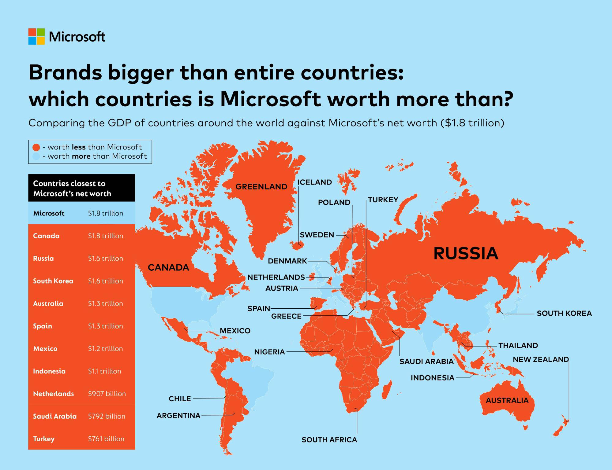 Если мы посмотрим на чистую стоимость компании Microsoft, которая составляет 1,8 триллиона долларов, дохода этой компании по-прежнему достаточно, чтобы сопоставить ее с Канадой, и только девять стран мира имеют более высокий ВВП, чем оценка Microsoft.