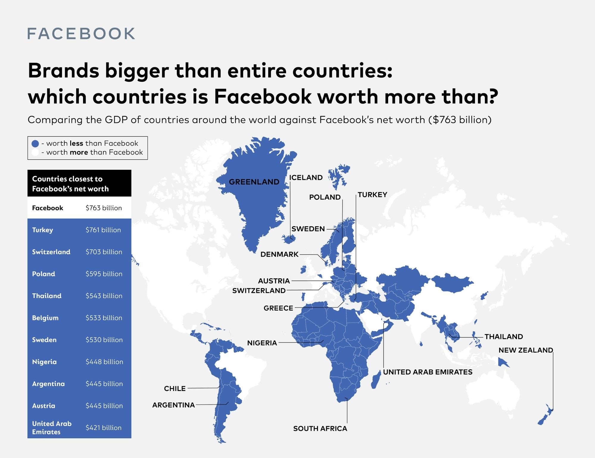 Общая стоимость компании Google составляет около 1,4 триллиона долларов, и только 12 стран имеют ВВП больше, чем эта гигантская компания. Те компании, которые еще не преодолели отметку в триллион долларов, — это Tesla, Facebook и Alibaba, но они по-прежнему входят в число самых богатых компаний мира.