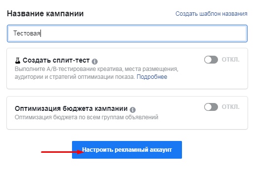 Затем дайте имя своей кампании. Оно может быть абсолютно любым. Это требуется для того, чтобы вы сами имели представление о группах и рекламных постах, которые в ней находятся. В качестве эксперимента присвоим ей имя «Тестовая». Также не забудьте установить, нужно ли A/B-тестирование и оптимизация РК.