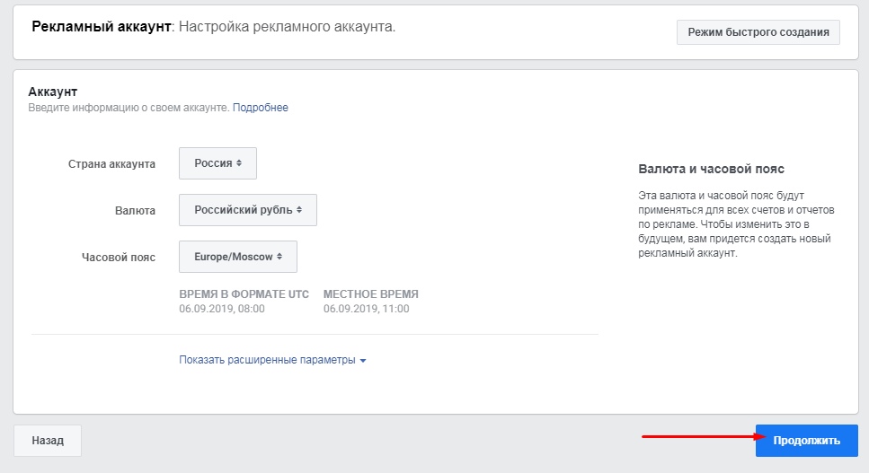 Вам нужно будет установить часовой пояс, ГЕО профиля и валюту, если вы до этого данные параметры не указывали. Выполните предложенные действия и кликните «Продолжить».