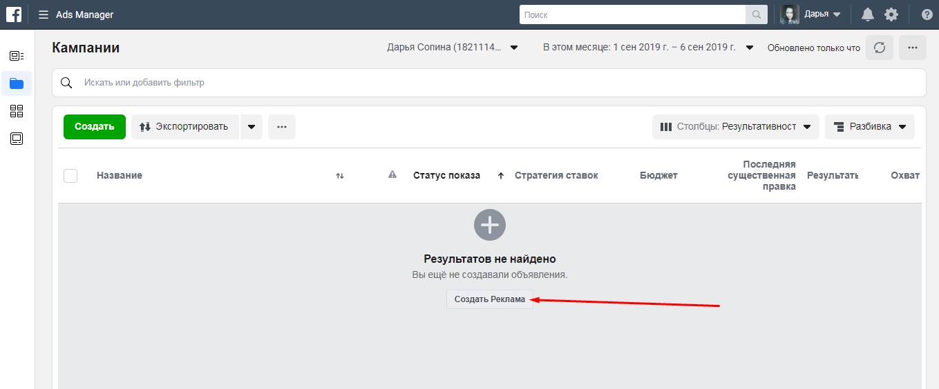 Для начала перейдите в Адс Манагер. Это, так называемая, панелька, с помощью которой вы можете управлять и контролировать всю вашу рекламу. На главном разделе будут отображены ваши РК. Если вы их создавали, тогда сможете отредактировать уже настроенные параметры. Если же вы их еще не делали или желаете создать новую, кликните на кнопку «Создать».
