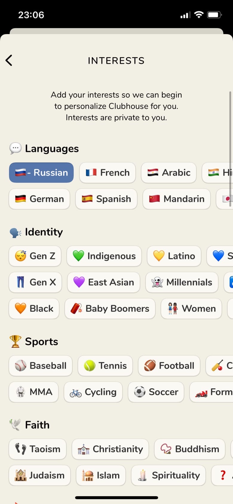 Следующая категория настроек — это интересы. То есть, у вас в рекомендациях могут выпадать комнаты по интересам, которые вы назначите в этом разделе.