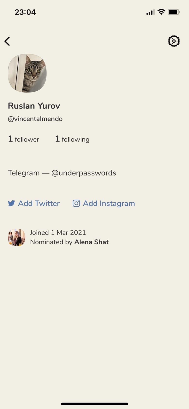 При регистрации у всех пользователей создается личный профиль. Здесь отображается ваш никнейм, который вы придумали еще на этапе регистрации, ваши подписки, подписчики и описание. Также тут можно присоединить две соцсети: Instagram и Twitter. Еще чуть ниже отображается человек, который пригласил вас в Clubhouse (кто дал вам инвайт).