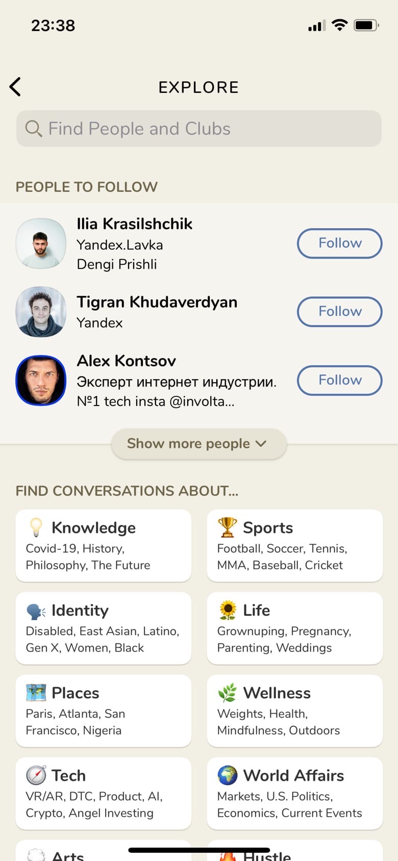 И переходим к четвертой кнопке — поиску. Здесь можно искать людей и подписываться на них или выполнять поиск по клубам. Клубы — это определенные «группы», где могут создаваться комнаты по интересам.