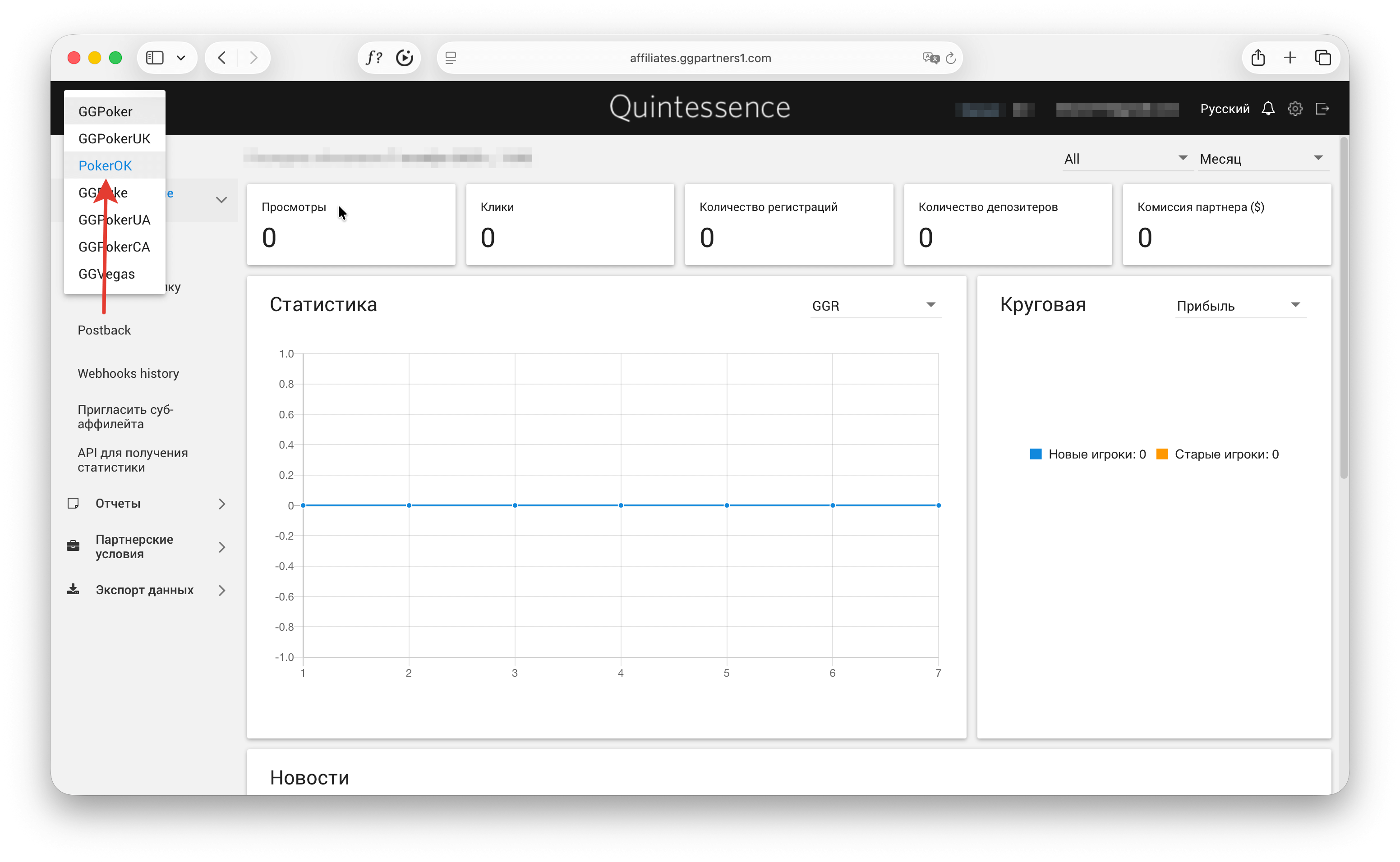 После авторизации обратите внимание на выпадающее меню в левом верхнем углу личного кабинета. ПокерОК Рartners сотрудничает с несколькими региональными брендами, поэтому важно выбрать нужную программу.