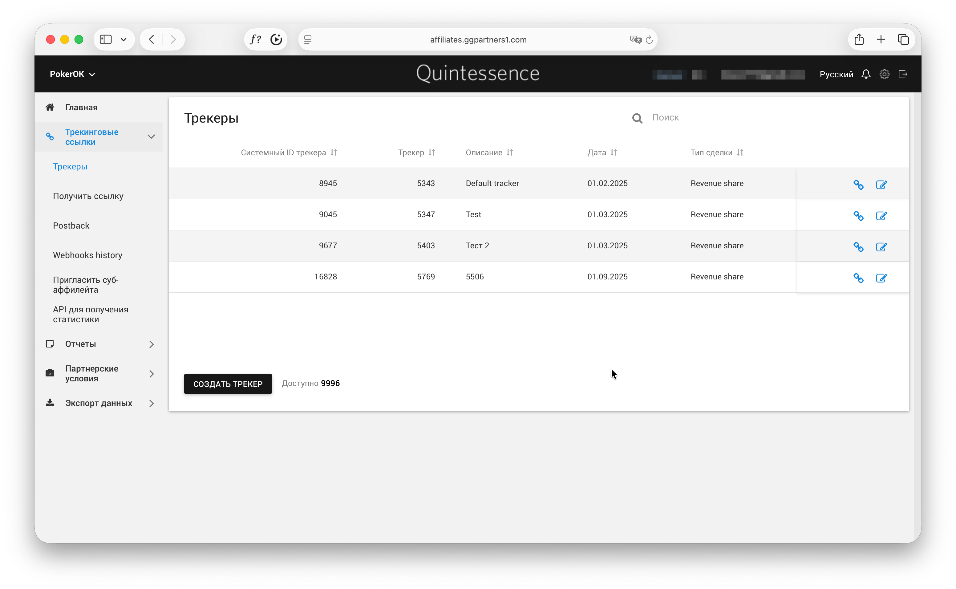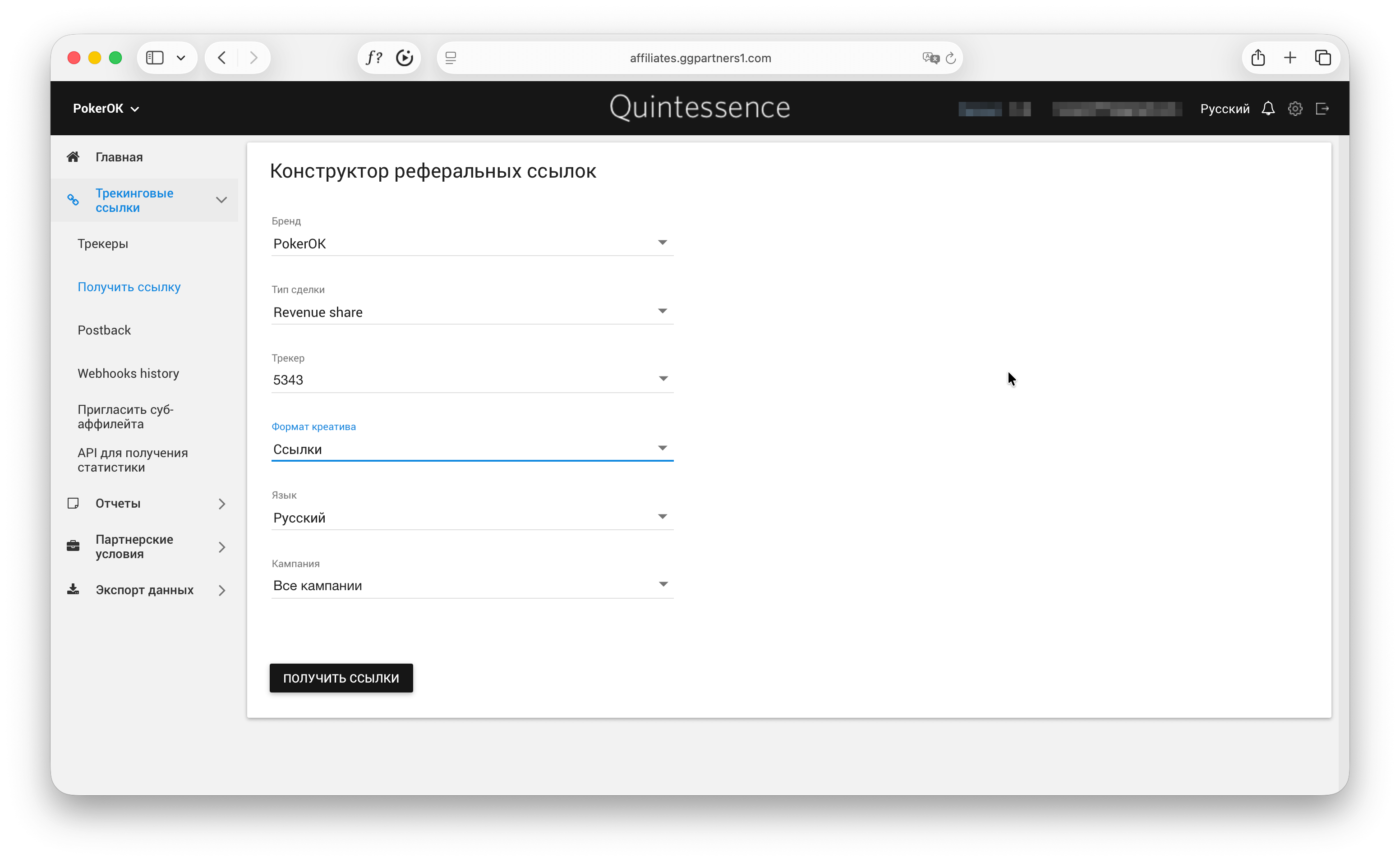 Следующий важный раздел в личном кабинете — «Трекинговые ссылки». Здесь арбитражники могут быстро создать уникальную реферальную ссылку для привлечения новых игроков. Как сформировать рефку?