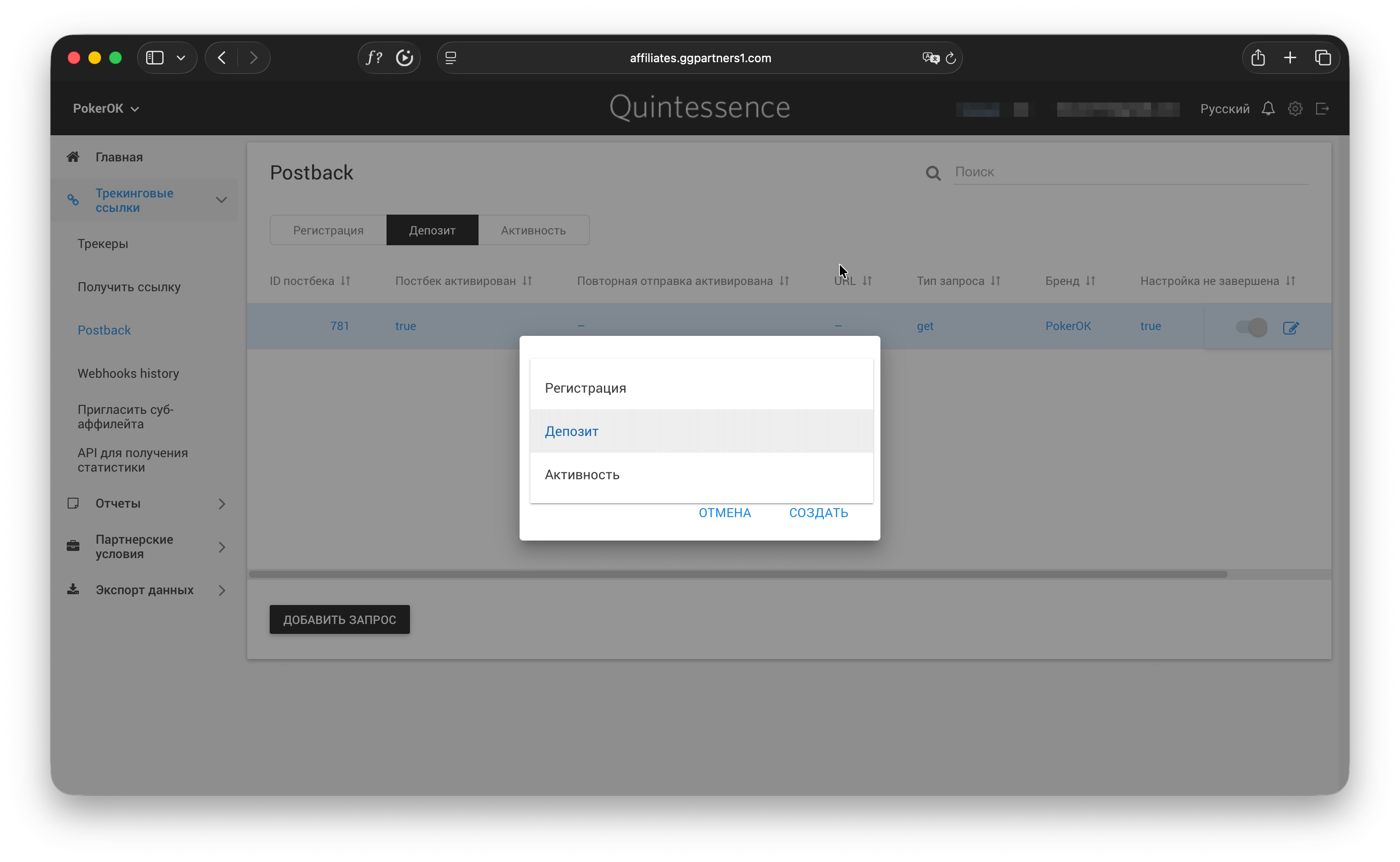 В этой вкладке можно настроить постбэки по регистрации, активности или депозитам.