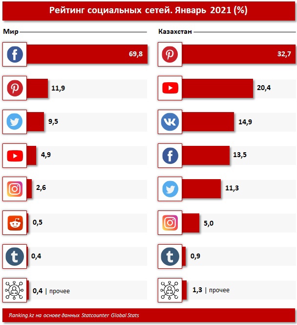 В январе 2021 года была опубликована статистика с рейтингом социальных сетей. По данным Statcounter Global Stats, второй по величине соцсетью в мире стала сеть Pinterest (11,9%).