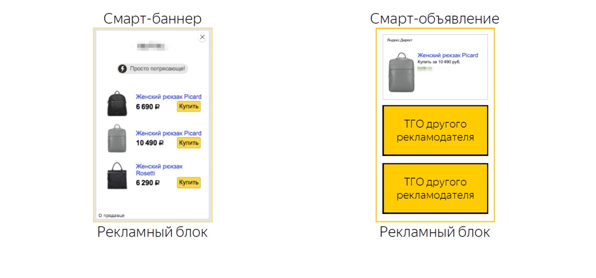 Смарт-объявления достаточно схожи с обычными текстово-медийными постами рекламной сети, но делаются без участия человека и подстраиваются под поведение отдельного юзера. Причем, смарт-баннерам требуется рекламный блок в полном объеме, а смарт-объявления разделяют его с остальными реклами.