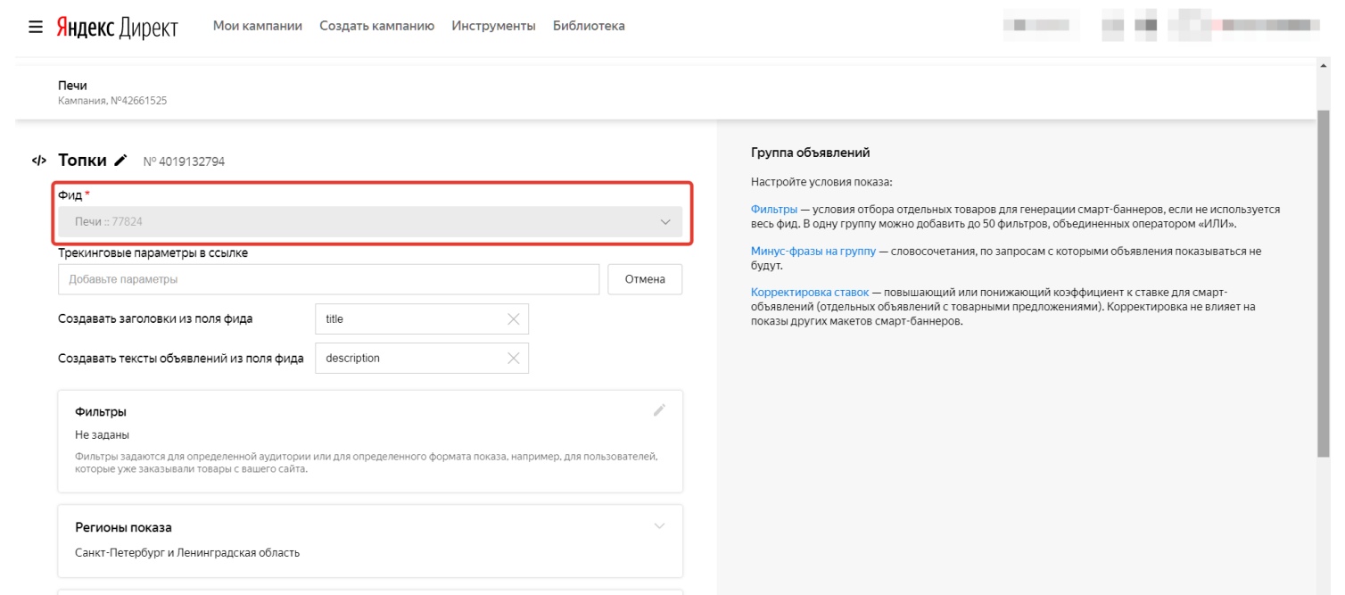 Если у вас единый фид на все продукты, сделайте группу объявлений и установите необходимые фильтры – категории, по которым устанавливается продукт для создания смарт-баннеров.