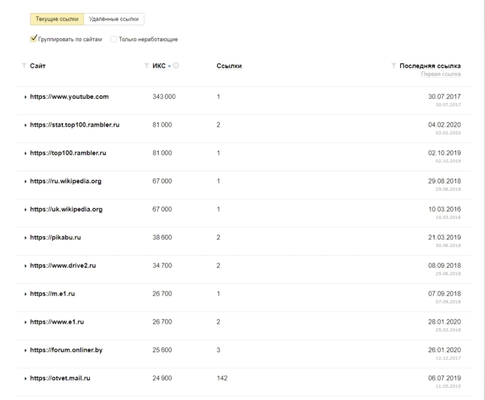 Здесь мы тоже можем посмотреть, с каких сайтов на ваш стоят ссылки. Они отсортированы по ИКСу, мы видим, в каком количестве они стоят.