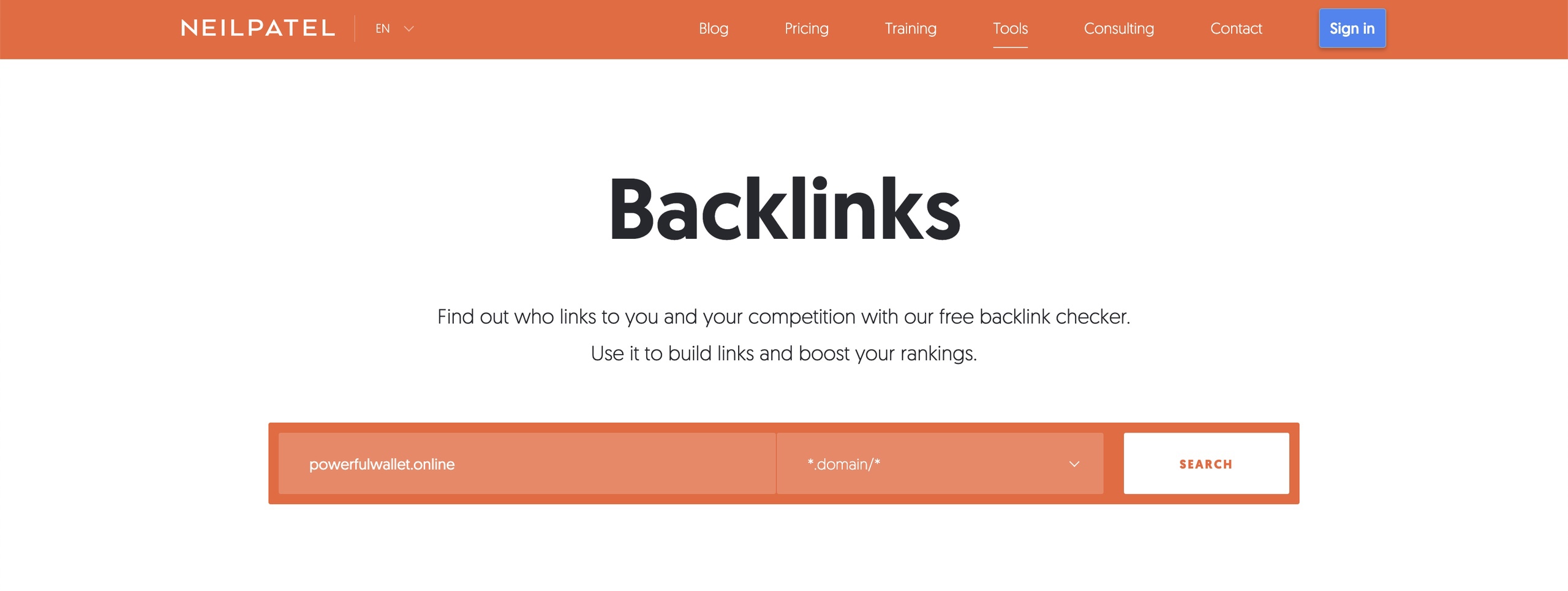 4. Не так давно вышел бесплатный инструмент от Neil Patel. Neil Patel — это западный интернет-маркетолог. Он купил один инструмент, сделал его бесплатным, и сервис весьма интересный. Конечно, не выдает такую детальную информацию с платформами, которые ориентированы только на аналитику ссылочного профиля, но все равно показывает неплохие результаты.