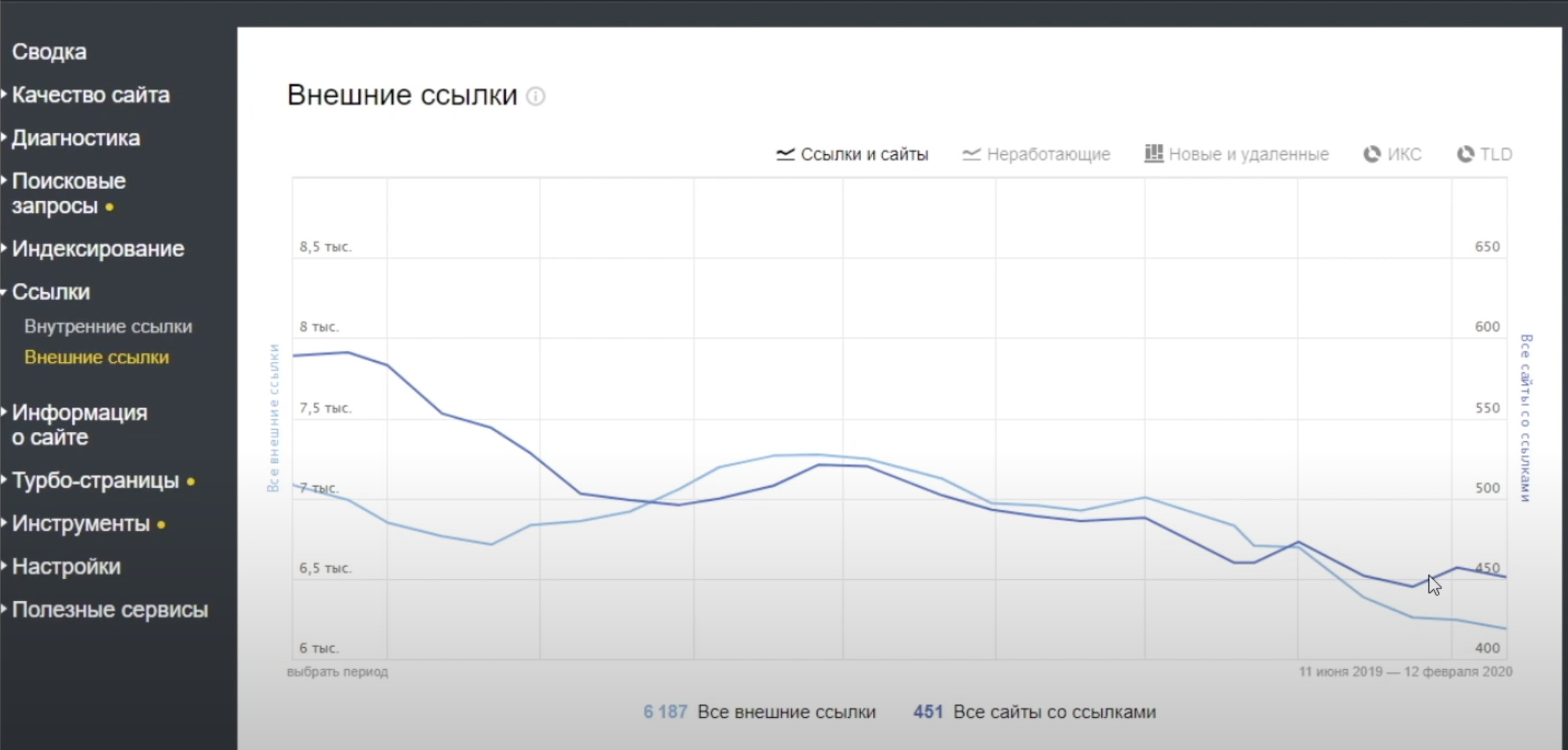 Теперь давайте посмотрим, как это работает в Вебмастере Яндекс. Здесь есть сводный график. Мы можем видеть, как меняется наш ссылочный профиль.