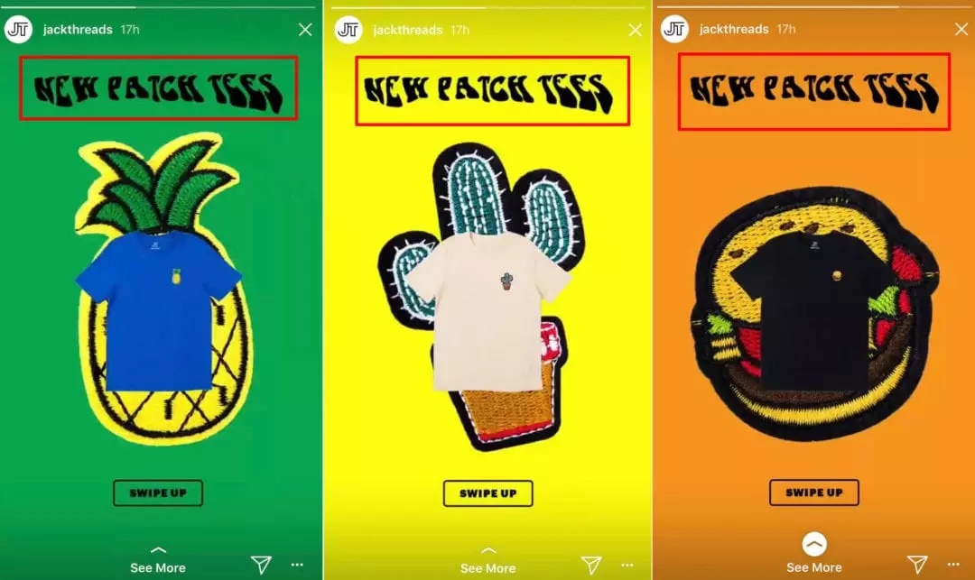 Возьмем, к примеру, JackThreads. После того, как они выпустили новые футболки, они используют истории в Инстаграм, чтобы сообщить своим подписчикам о новом продукте.