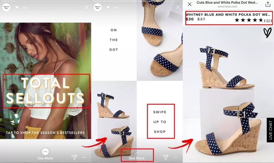 Рассмотрим стратегию Lulus. Когда они выставляют товары на продажу, они информируют своих подписчиков и добавляют интерактивную ссылку, чтобы заинтересованным фолловерам было проще узнать о продукте: