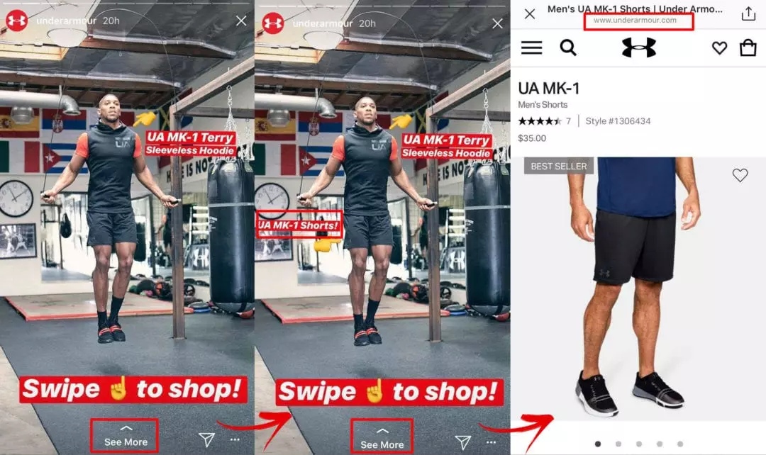Многие бренды используют эту функцию, чтобы упростить процесс покупки. Например, UnderArmour делится историями с влиятельным лицом, чтобы намекнуть, как их одежда будет выглядеть в действии. Они также включают интерактивные ссылки, чтобы их подписчики могли узнать больше о понравившемся товаре.