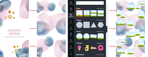 - Сохраняем результат и разрезаем на отдельные посты (квадранты одинаковых размеров) в сторонних сервисах – в самом Canva инструмента для разрезания нет.