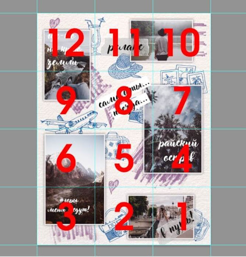 - Размещаем 9 из 12 фотографий по сетке произвольным образом (но так, чтобы стилистика была +/- одинаковой).