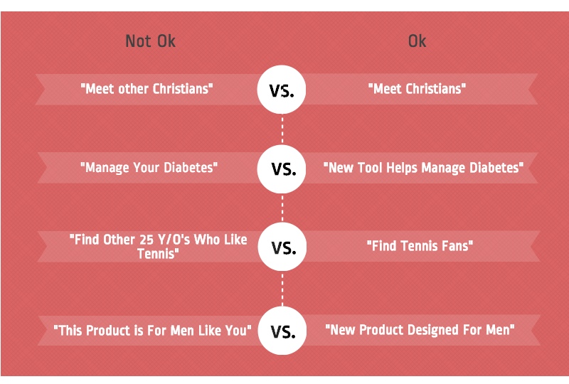 Вот почему вам нужно сосредоточиться на контексте, а не только на отдельных словах. Обратите внимание, что в примере «Ознакомьтесь с нашим продуктом, разработанным для таких мужчин, как вы» не используется слово «ваш» или «другой», но он подразумевает личные качества, поэтому вы не получите одобрения, если воспользуетесь этим текстом.