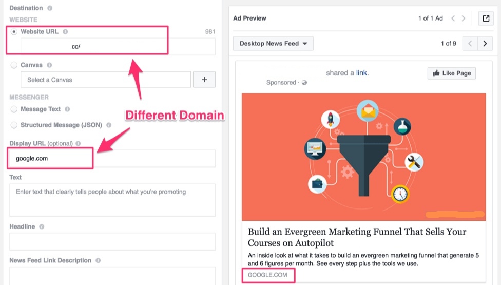 Одна из наиболее частых причин отклонения рекламы сегодня заключается в том, что отображаемый URL не соответствует домену, на который объявление отправляет людей.