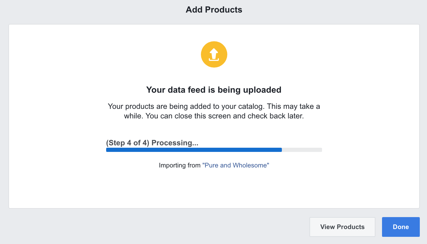 - Вы увидите, что ваши данные загружаются. После этого проверьте, все ли товары были добавлены в каталог во вкладке «Товары».