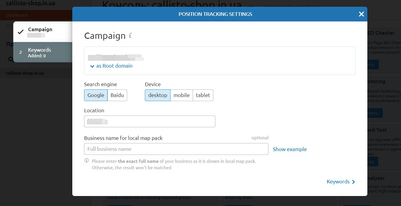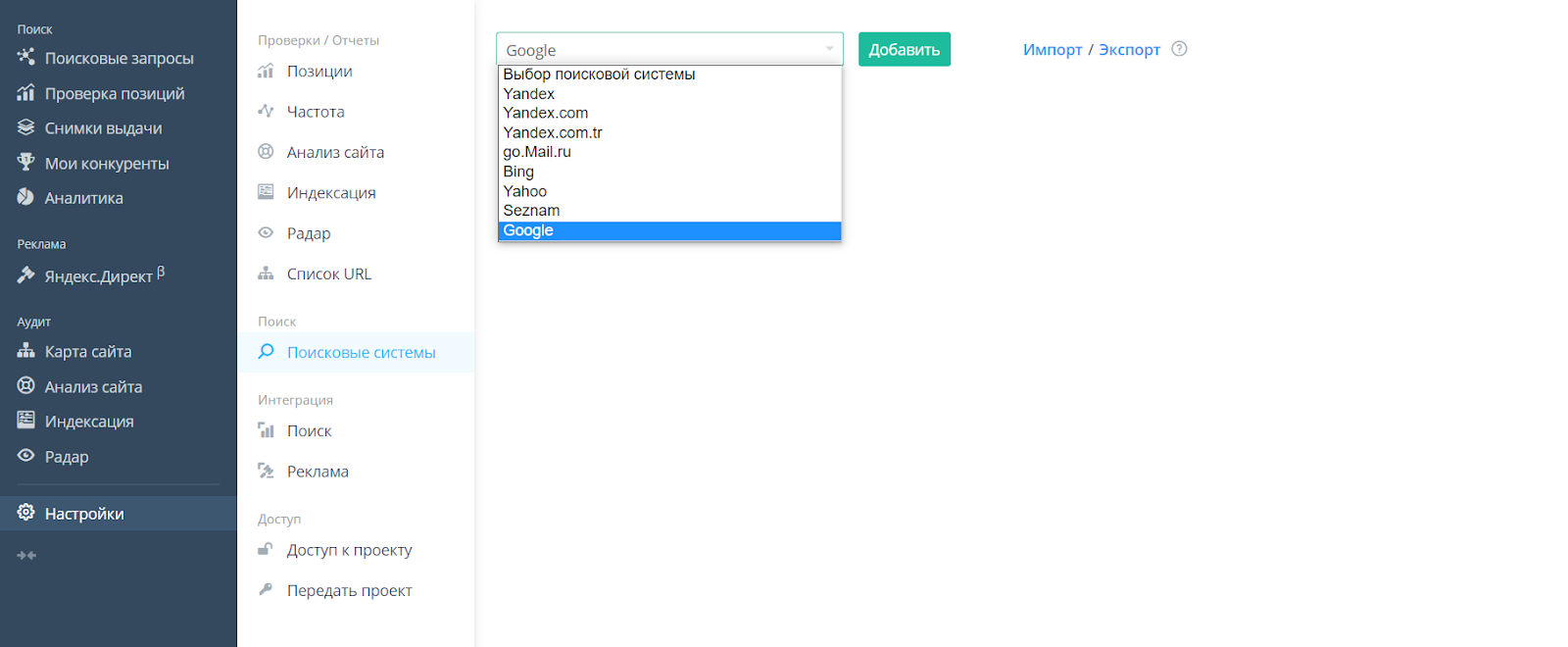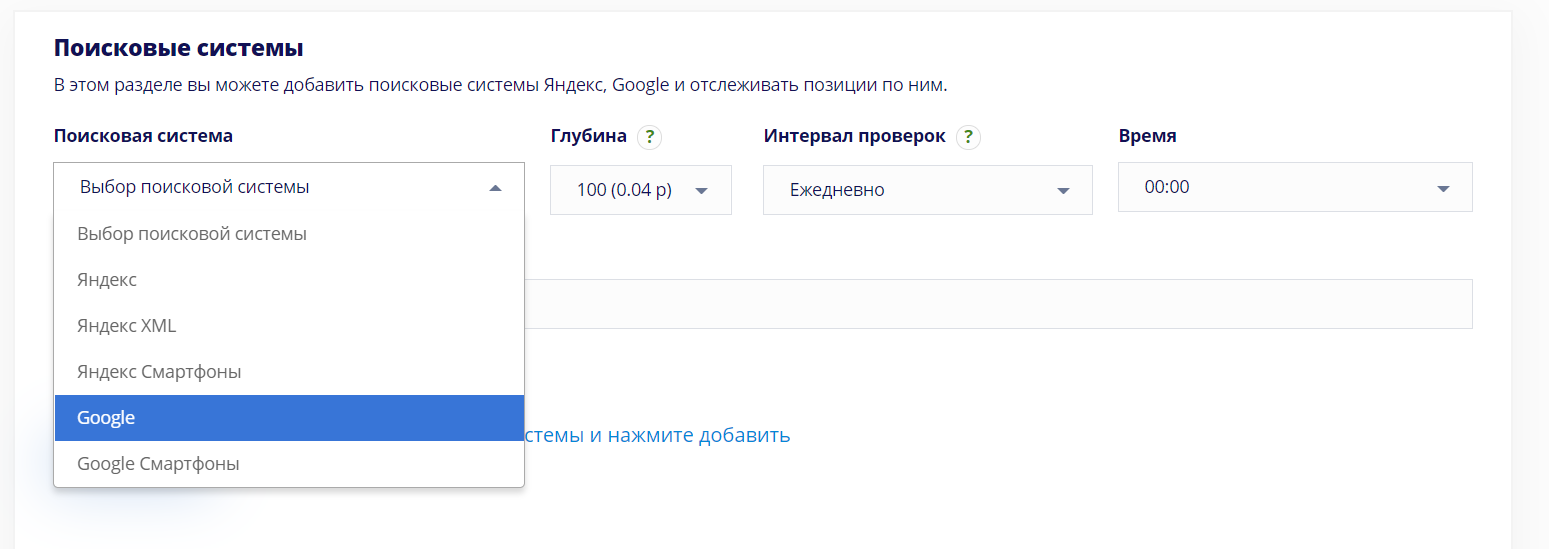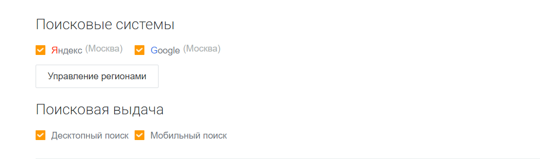 При интеграции ресурса вы можете указать, в каком поисковике следует снимать позиции и для каких типов устройств (Desktop / Mobile). А также: