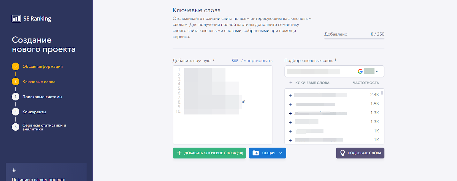 После этого понадобится внести ключевые фразы, по которым вам нужно отслеживать свои позиции. Тут есть функция «Подобрать слова» — алгоритмы в автоматическом режиме подберут для вас ключевики, опираясь на содержимое вашего ресурса.