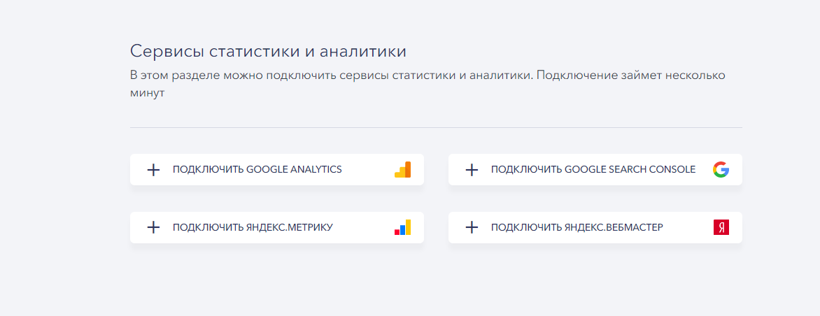 Плюсом является то, что вы можете сделать подключение инструментов для проведения анализа и панели вебмастеров Google и Yandex.
