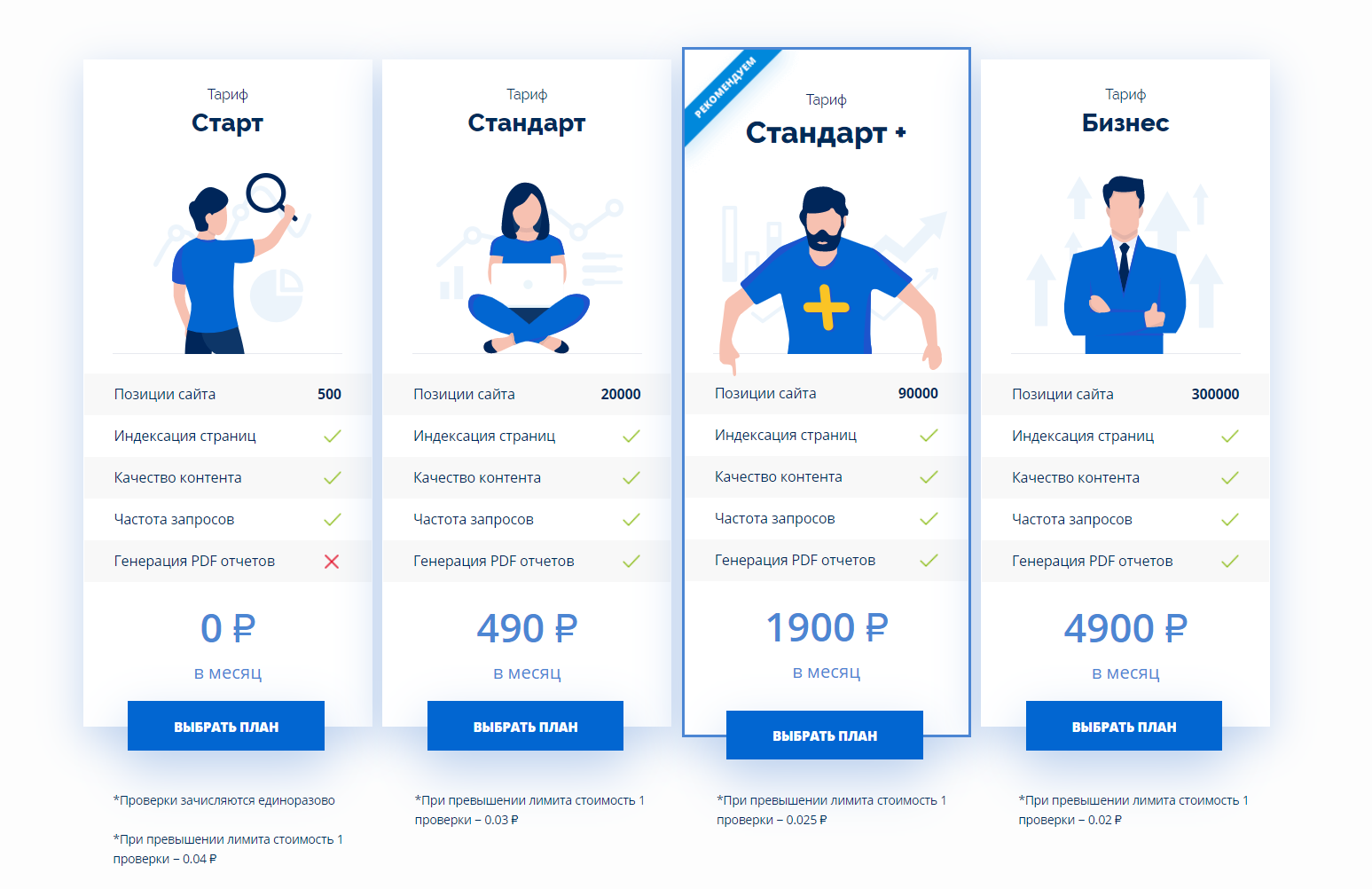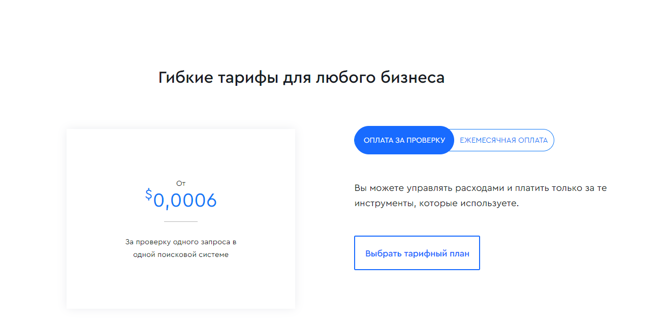 Вы можете пользоваться сервисом абсолютно бесплатно. В данном тарифе можно выполнять до 500 позиций/мес. Цена 1 проверки после превышения этого ограничения составит 0,04 рубля. Самая базовая подписка стоит 490 руб/месяц. В ней каждый месяц можно делать 20 000 проверок.