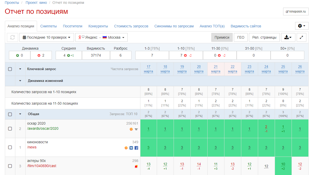 - Встроены графики для мониторинга, как менялась позиция ресурса и видимости запросов;