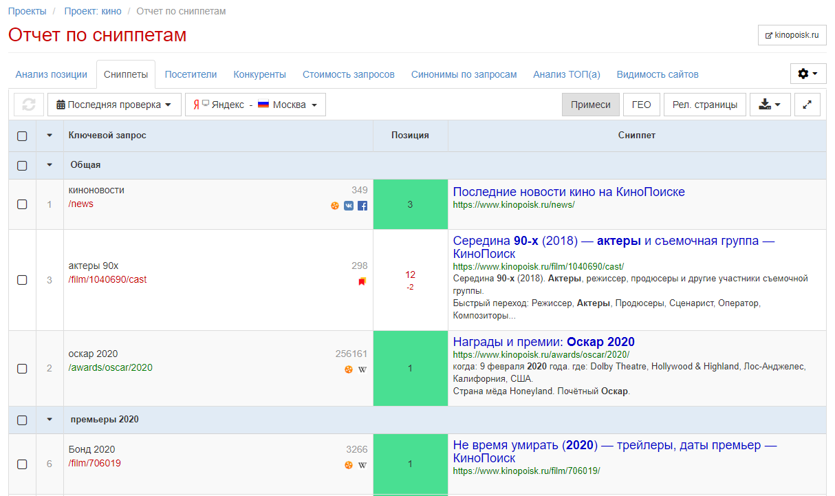 - аналитика сниппетов (бесплатно);