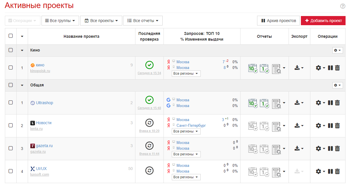 - Локальное отслеживание. Проверяйте позиции ресурса в выдаче Yandex и Google любого ГЕО, области и на любых языках;