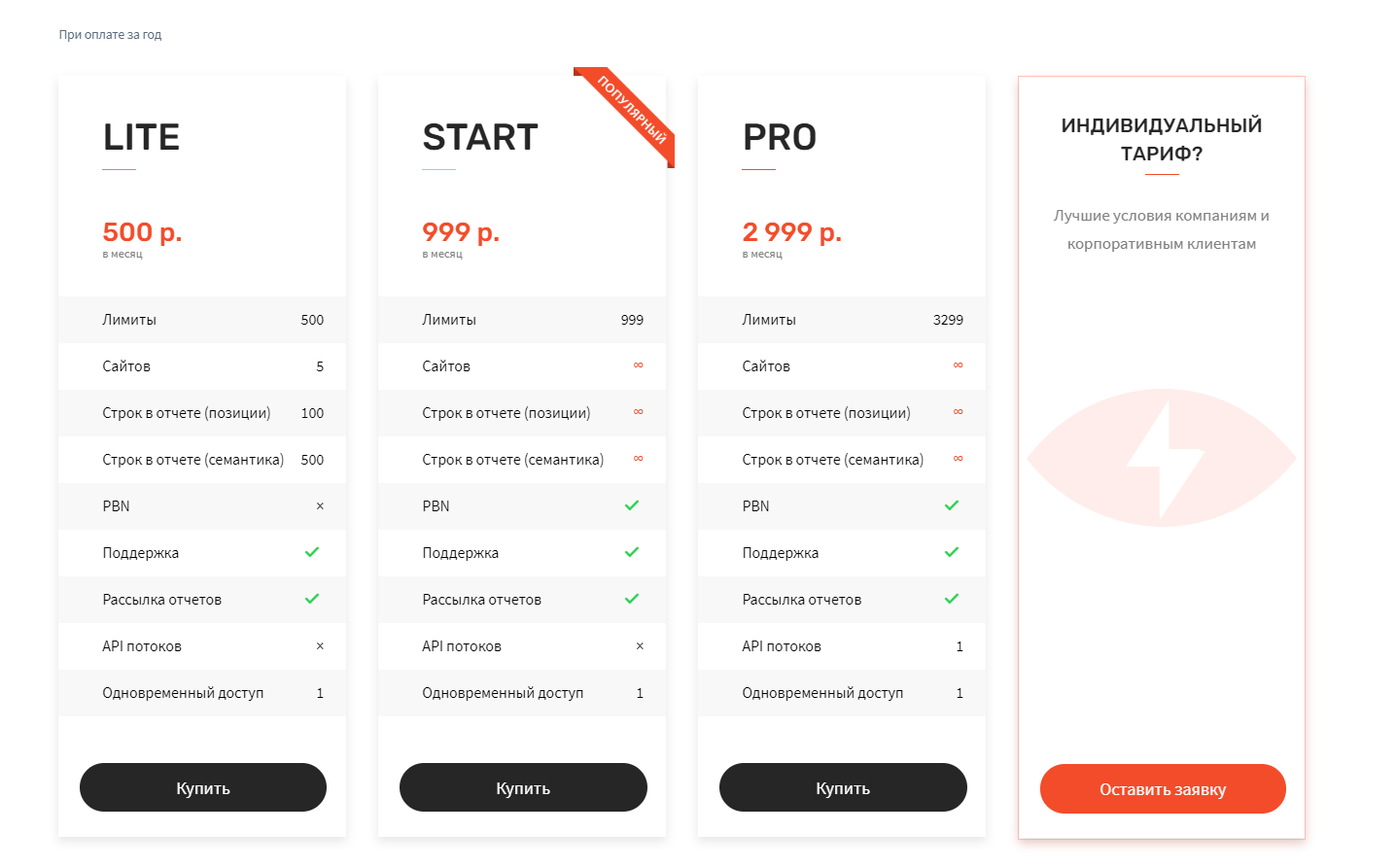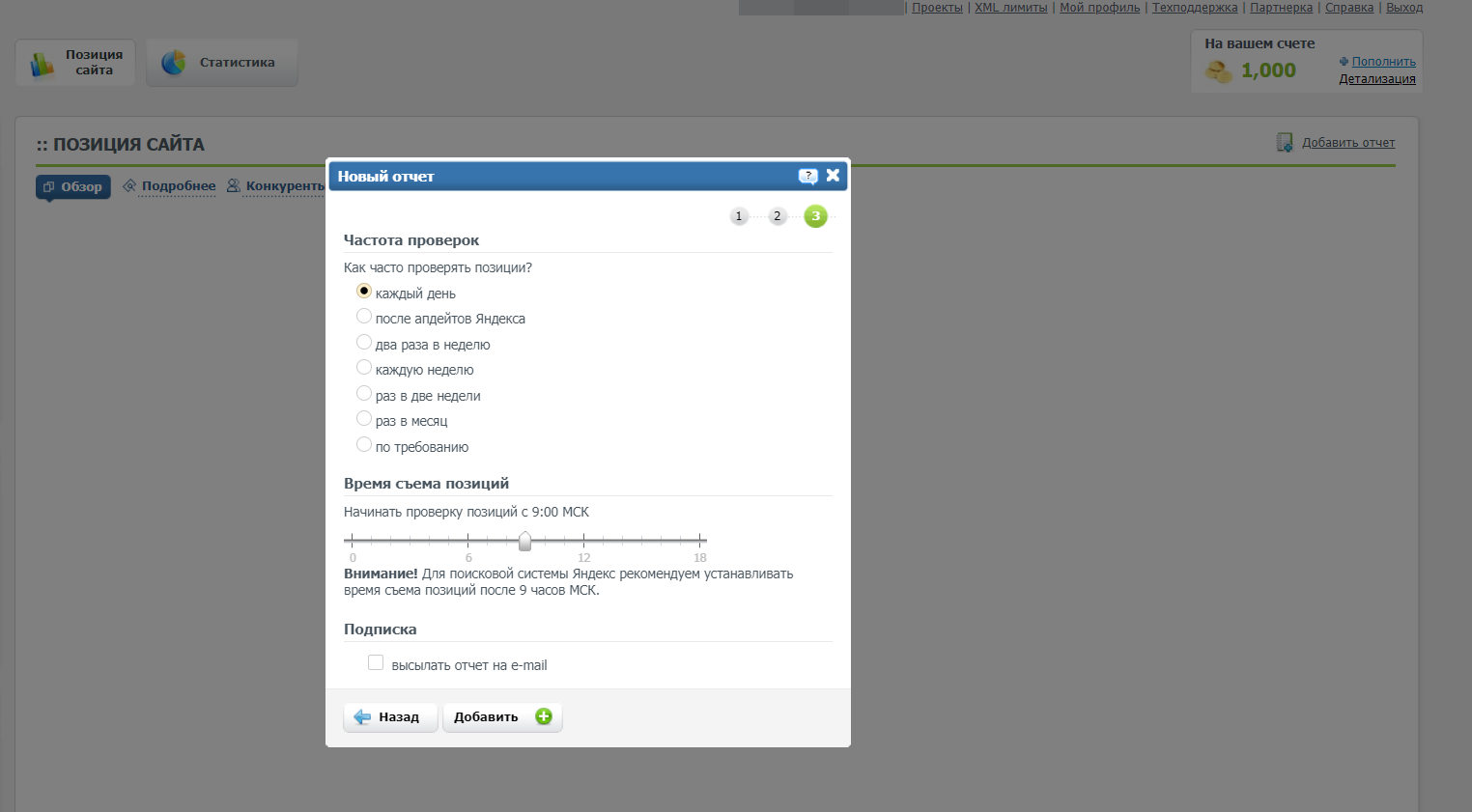Затем вы можете закинуть денег для получения требуемого числа проверок. Либо же подключите подписку (от 999 руб/мес) — подойдет, если надо осуществлять постоянный съем позиций в крупном количестве.