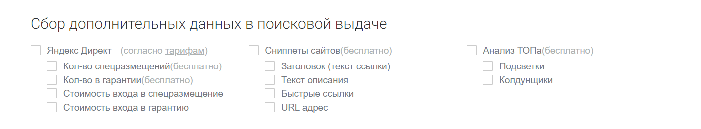 - парсинг информации о числе рекламных спецразмещений и гарантированных демонстраций в Yandex.Direct (бесплатно);