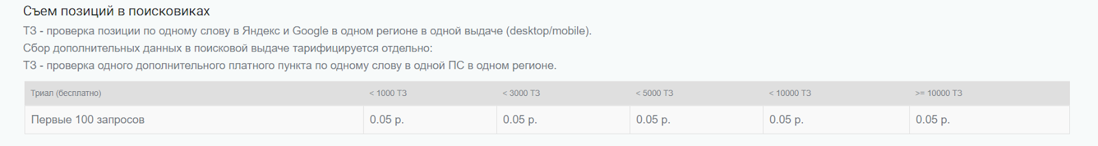 Чтобы посчитать конечную сумму, в сервисе применяется у.е. под названием ТЗ. 1 ТЗ — проверка по 1-ой фразе в Yandex и Google, в одной области, в одном виде выдачи (Desktop / Mobile).