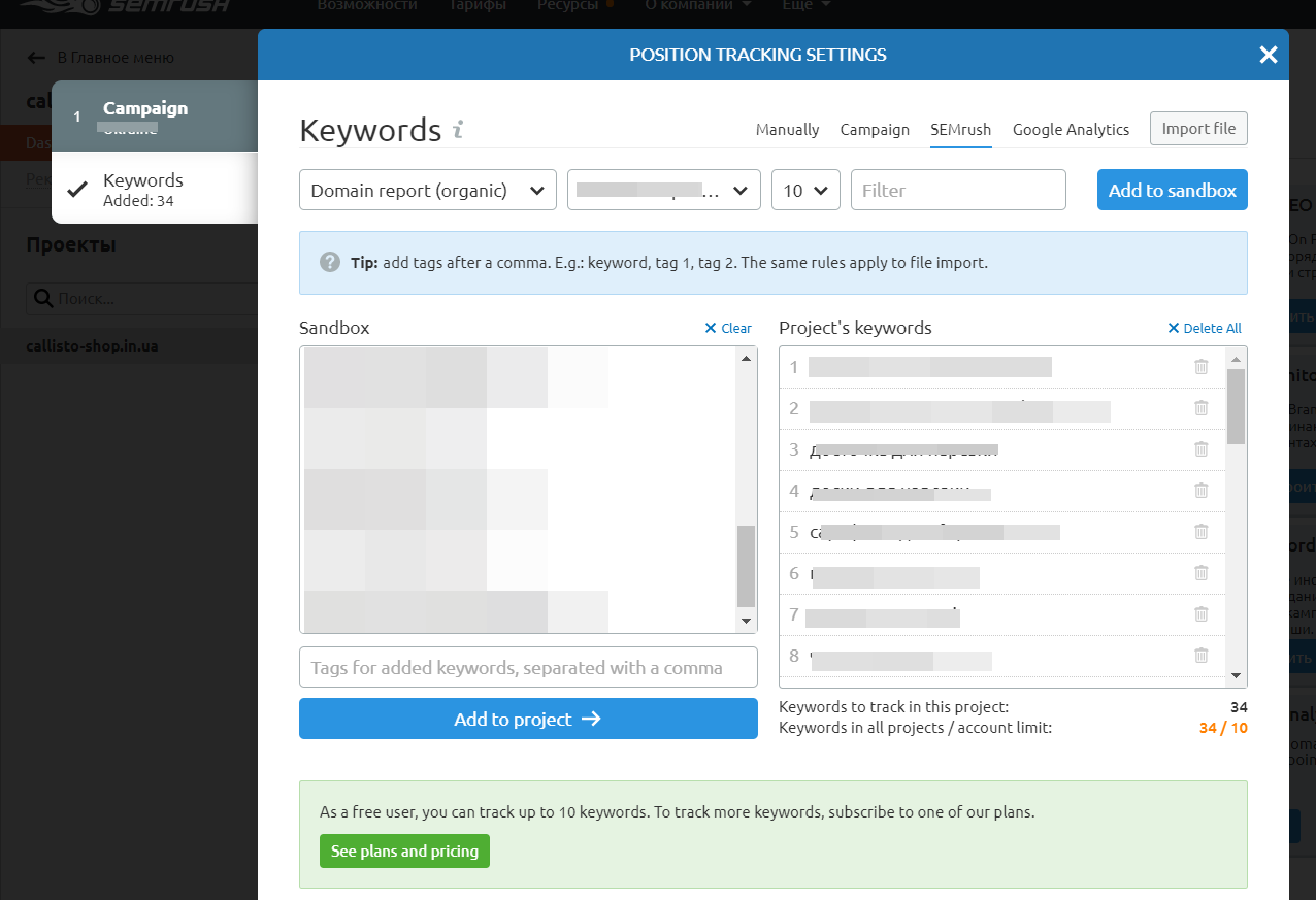 Сервис имеет триал — 2 недели пользования полным функционалом площадки. После того, как триал закончится, вас попросят перейти на платный тариф, который выйдет вам в 10 евро/мес. для одного ресурса. В платном тарифе можно проверять до ста ключевых фраз.