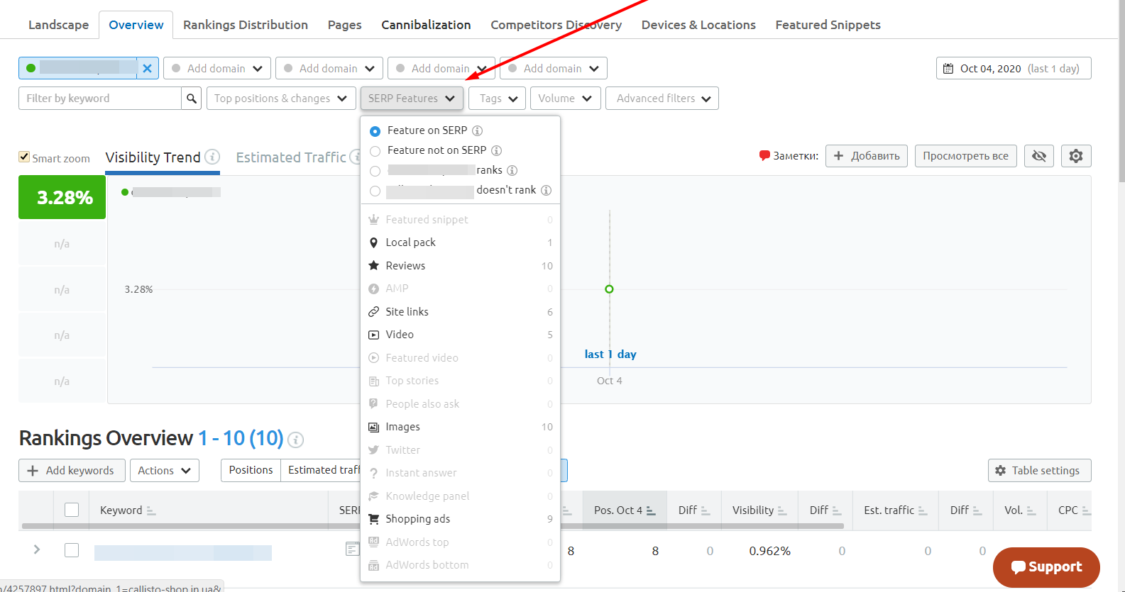 В разделе «Features» доступна подсветка видов различных спец элементов выдачи (колдунщиков), в которых показывался ваш ресурс. Помимо всего прочего, показываются виды спец элементов, которые есть в выдаче по этой ключевой фразе, но ваш проект в них еще не входит.