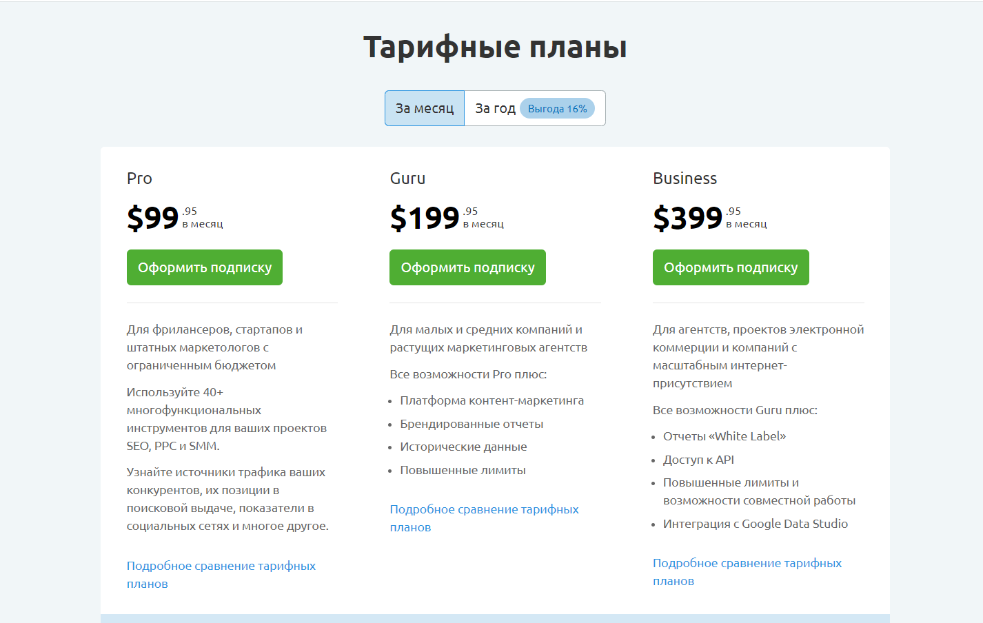 Чтобы пользоваться платформой, потребуется оформить одну из предложенных на сайте подписок. Базовый тариф обойдется вам в 55 долларов/мес (на момент написания статьи).