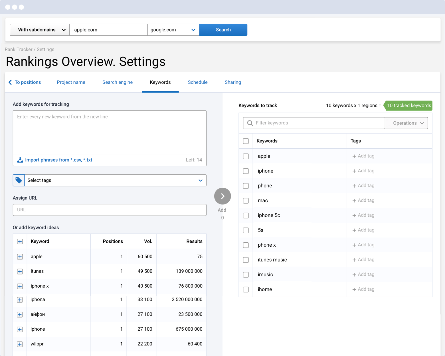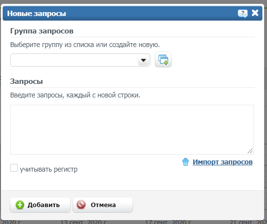 Запросы для отслеживания вы можете внести как самостоятельно, так и при помощи импорта файла.