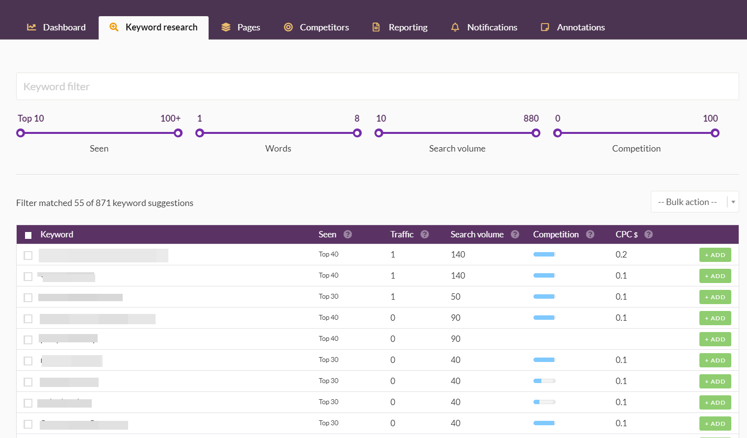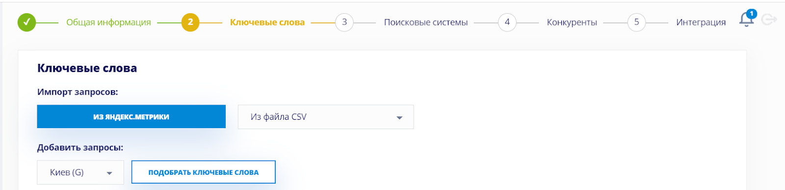 - Ключевики доступно прописывать как самостоятельно, так и посредством загрузки файлов. Также платформа способна автоматически предложить релевантные ключевые фразы;