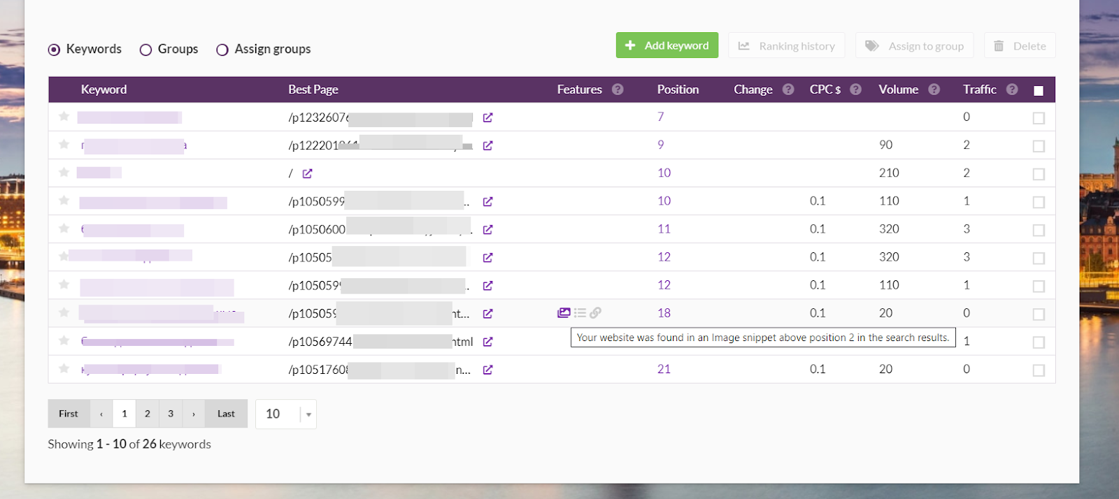 Вы можете отсортировать отчет по времени, группе ключевиков, последней позиции, скачать в CSV или PDF.