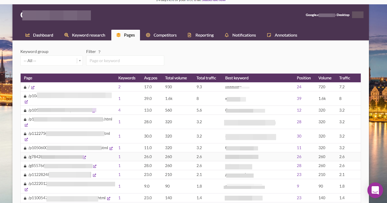 Также есть детальный отчет по страницам. Тут вы можете проверить число ключевых фраз, по которым сайт отображается в выдаче, усредненную позицию, общую частоту запросов, а также самая подходящая ключевая фраза, по которой на сайт идет больше всего трафика.