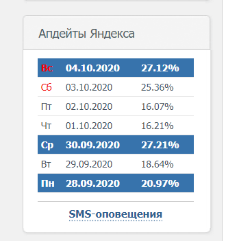 Еще одна немаловажная фича — отображение даты одних из последних обновлений алгоритмов Yandex и то, как они влияют на поисковую выдачу. Также можно включить SMS-оповещения.